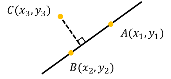 먼저 한 점이 직선에 이르는 가장 가까운 위치는 해당 점에서 직선까지 수선을 내렸을 때 교차하는 지점이다. 따라서 해당 지점을 구하기 위해서는 직선에 수직이면서 한 점(C 지점)을 지나는 새로운 직선과 원래 존재하던 직선의 교점을 구하면 된다.