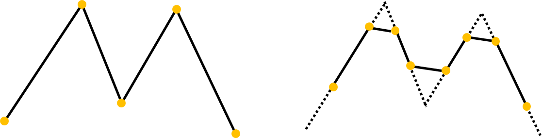 꺾인 선은 한 번 Chaikin 알고리즘을 거칠때마다 시작점과 끝점을 제외한 지점들이 2배씩 늘어난다.